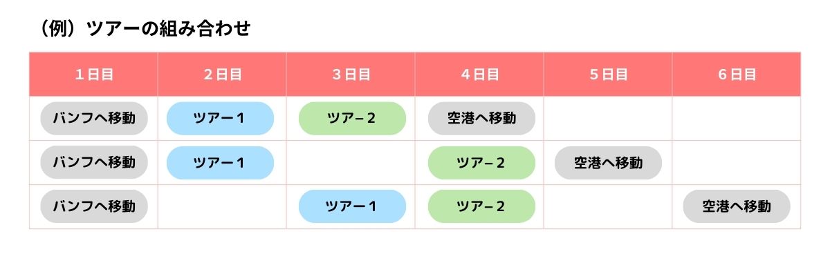 | 特記事項 | ・ツアー内容は以下の各ツアーページでご確認ください。 ・1名様でのご予約の場合、5, 6, 10月は2名様料金にて承ります。ツアー当日に他のお客様が参加された場合、1名様料金に減額いたします。 ・キャンモア発着の場合は、おひとり様あたり「$60+消費税」の追加料金となります。 ・空席状況によって「コロンビア大氷原ツアー」「レイクルイーズ・モレーン湖&ヨーホー国立公園ツアー」の順番を入れ替える場合があります。 ・お申し込み前に よくあるご質問 をご確認ください。 |