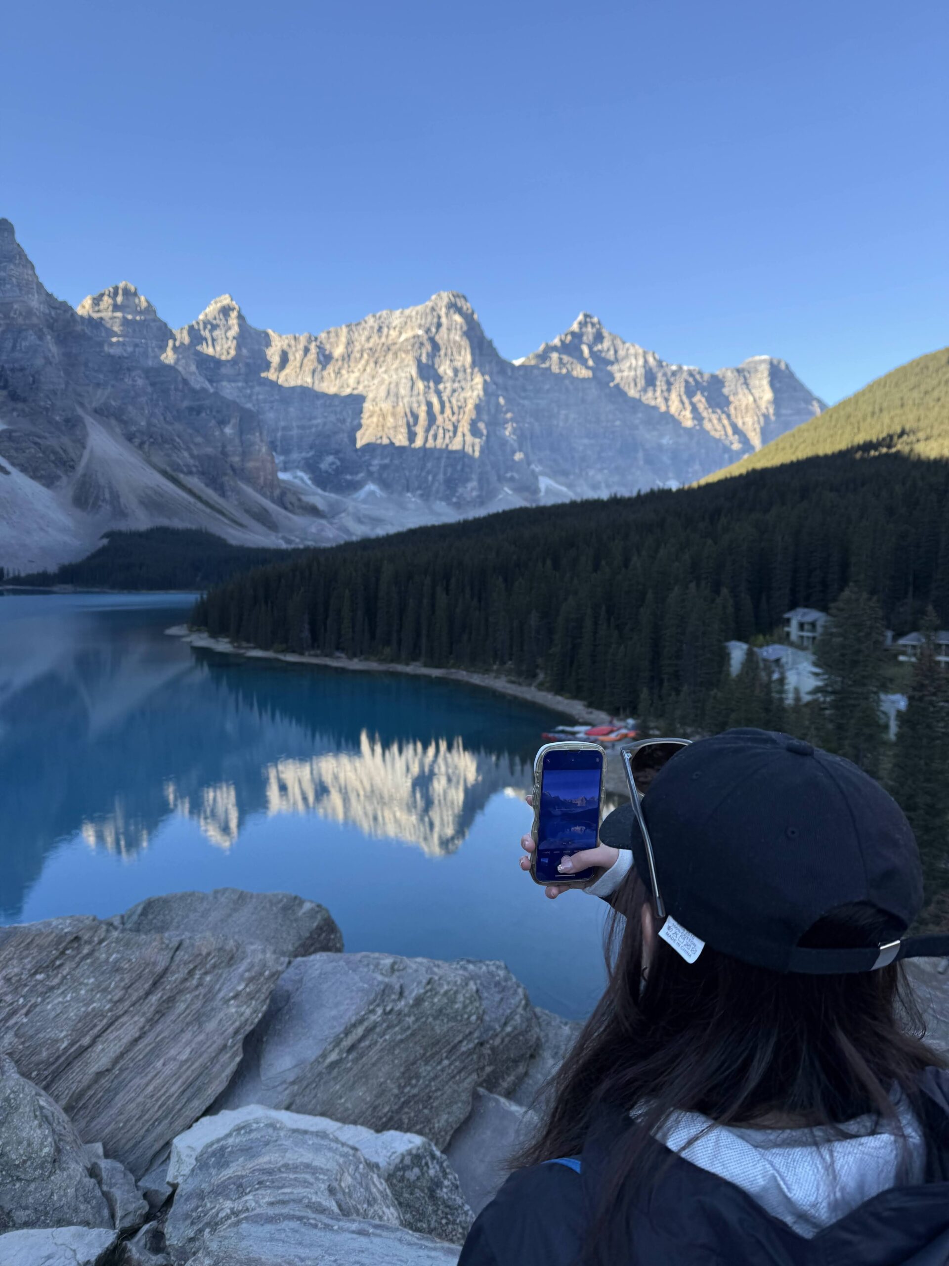 朝のレイクルイーズは、まるで時間が止まったかのよう。湖面は穏やかで、山と氷河を完璧に映し出します。