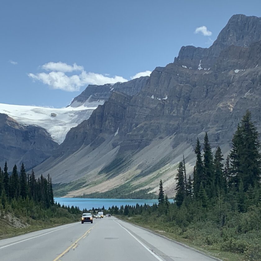 アイスフィールド・パークウェイに入ってすぐの湖を車窓から。風のない午前中は水面が鏡のようになり、山々がくっきり映り込むこともあります。「通り過ぎるだけ」でも印象に残る、ロッキーらしい景色です。