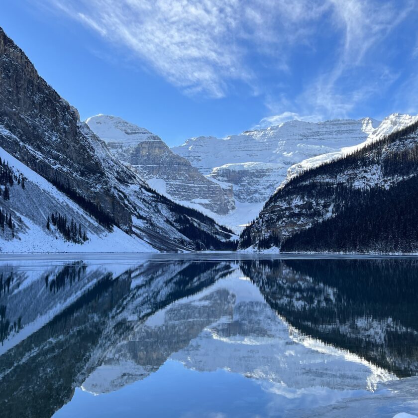 GWのレイクルイーズは凍結しています。静けさの中に氷河の迫力が際立つ季節。夏のターコイズとは違う、“白と青の神秘的な景色”を落ち着いて楽しめます。混雑が比較的少ないのも、この時期ならではのメリットです